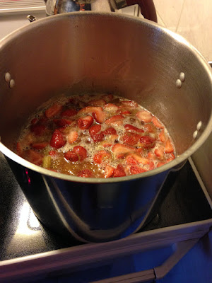 Throw everything in the pot. I finally perfected stewing rhubarb. The key is to add a little water and keep stirring until rhubarb breaks apart into chunks of threads. Then add the strawberries. You can skim off the foam if you want.
